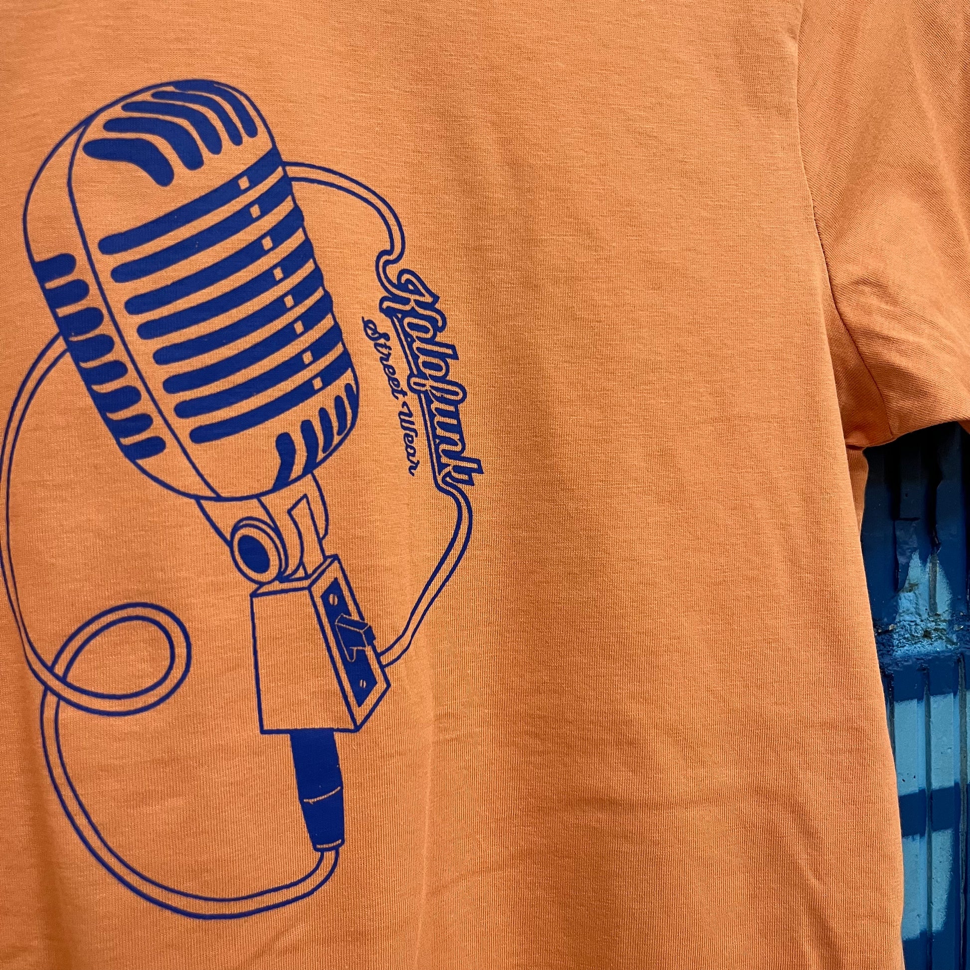 Camiseta de manga corta en color naranja pálido con estampado retro en tono azul